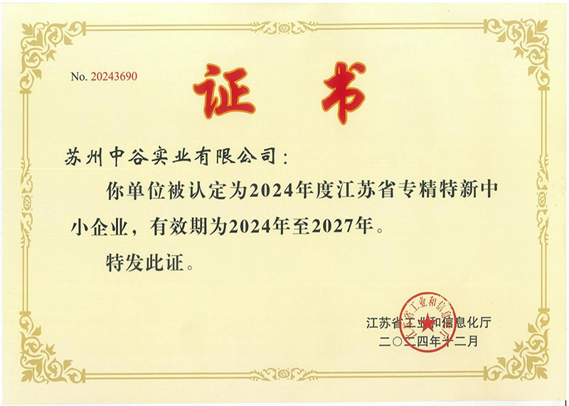 江蘇省專(zhuān)精特新企業(yè)證書(shū)